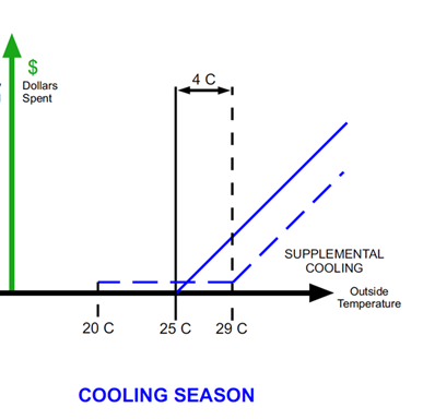Looking at the cooling season, the blue dotted line represents the use of both HVLS ceiling fans and HVAC equipment whereas the blue solid line is just an HVAC unit. By activating HVLS fans at 20°C, you can delay the use of the AC unit from 25°C to 29°C. This pushback greatly benefits the lifespan of HVAC equipment. On average, HVAC devices have a lifespan of 15 years. However, with the use of HVLS fans, you can prolong this lifespan to over 17 years. In addition, you can optimize the usage of HVAC devices and be able to reduce needs for repair caused by prolonged usage.