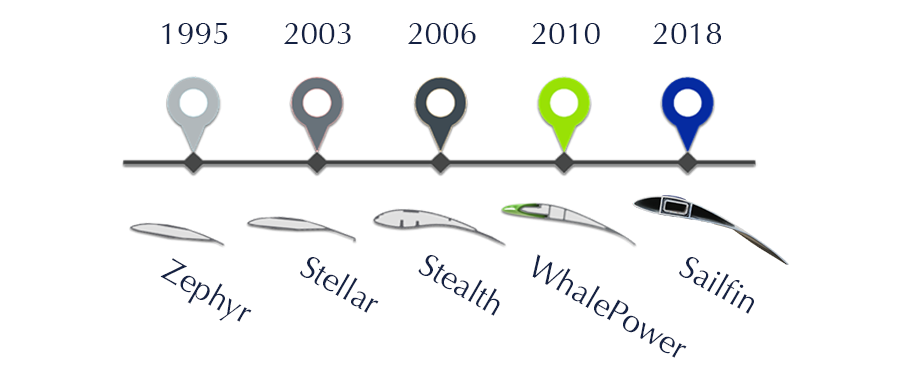 As shown in the image on the left, you can see the evolution of ceiling fan blades from Envira-North. As you progress from left to right, you can see how the blade design has evolved and changed over the years. The progression from older models like the Zephyr to our current blade, the Sailfin, highlights the key advancements in airfoil technology.